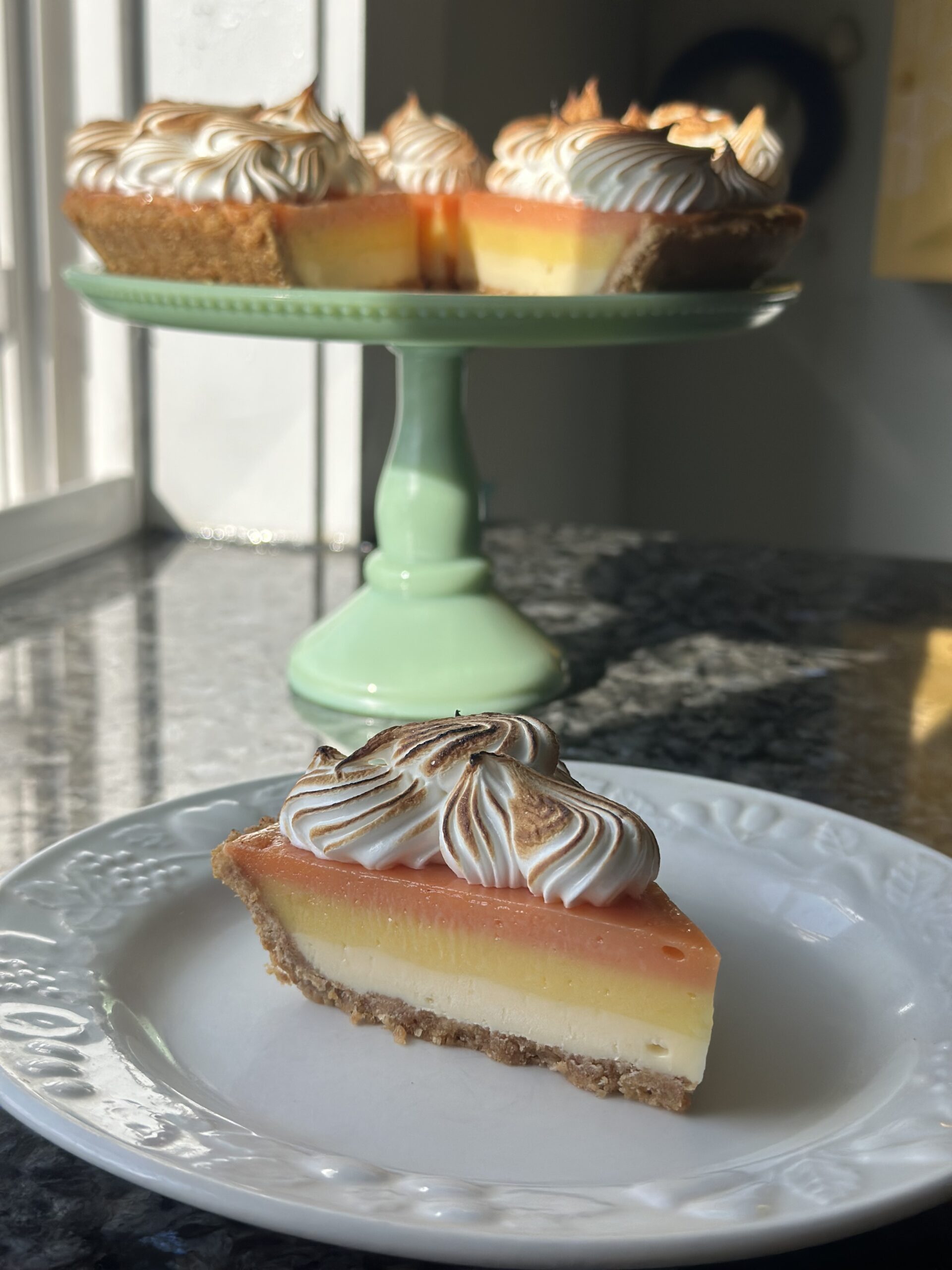 Back by popular demand! Graham cracker crust, layers of tangy key lime custard, orange and lemon curd, toasted vanilla meringue.